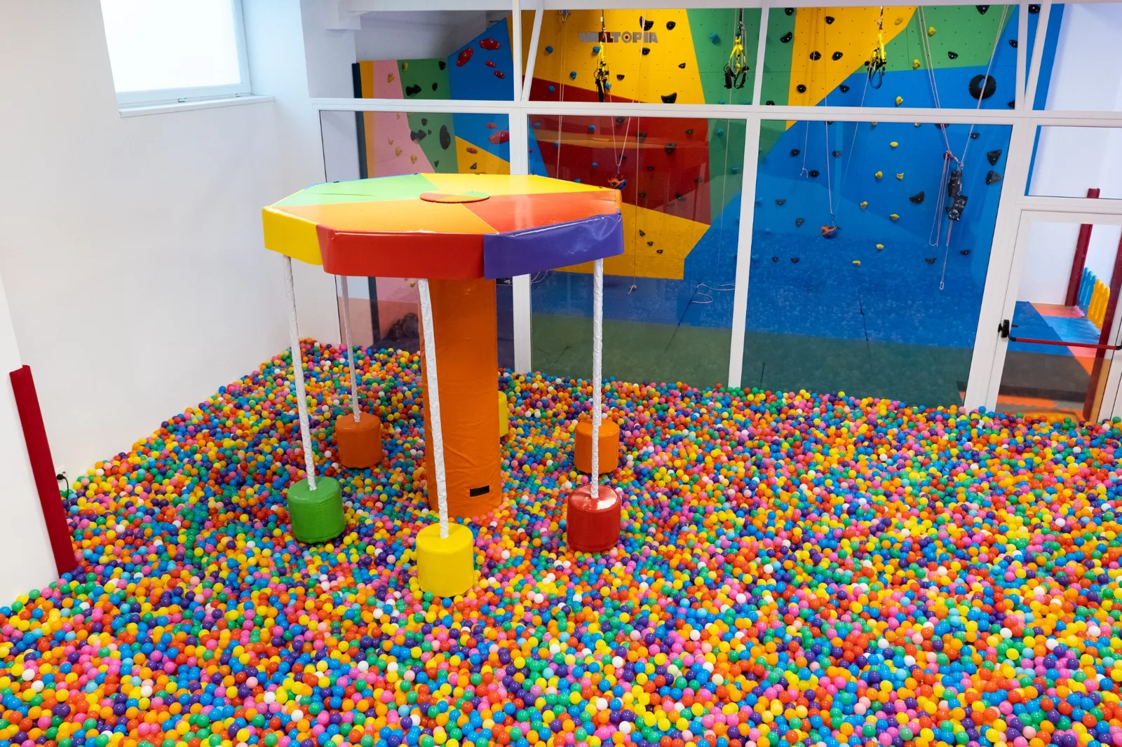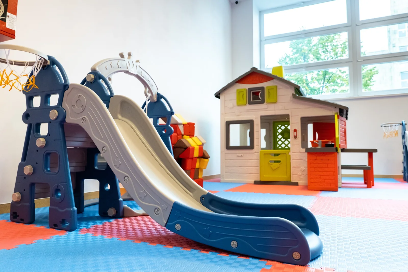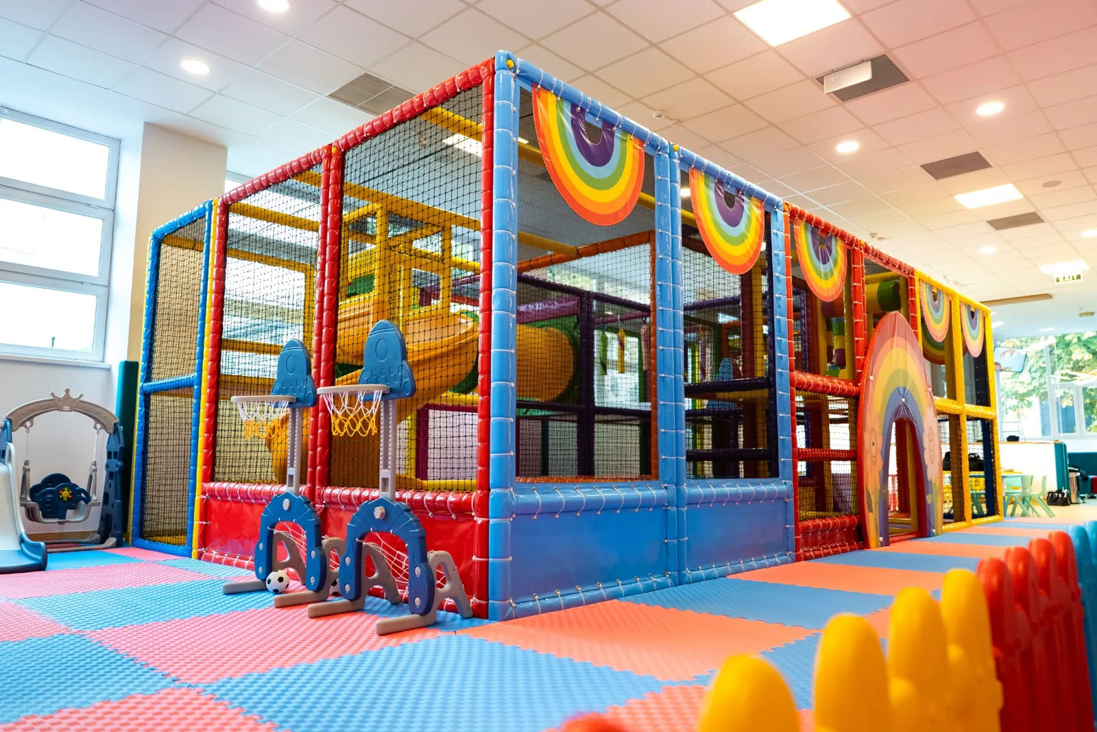 La Bucuria Copiilor găsești un spațiu sigur și colorat pentru cei mici: zone de cățărat, tobogane, trambuline și colțuri creative.